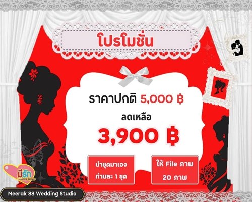 ชุดเจ้าสาวเจ้าบ่าว เริ่มต้น 2,500 บ., ชุดไทย เริ่มต้น 1,500 บ., ชุดแฟชั่น เริ่มต้น 500 บ., มีให้เลือกกว่า 500 ชุด